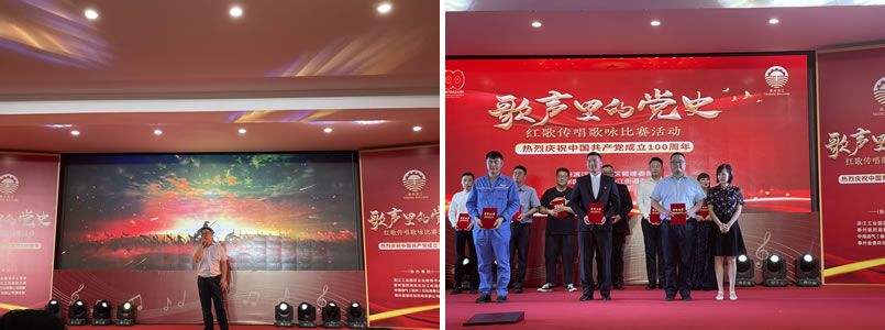 百年沧桑,百年风华,漫漫征途忆峥嵘岁月,红歌嘹亮颂百年初心。6月25日下午,在党的百年华诞即将来临之际,我公司员工陈国华、党支部积极分子黄芹参加了滨江园区举办的“歌声里的党史”红歌传唱歌咏比赛。 黄芹的一曲《我的中国心》拉开了整场歌咏比赛的帷幕,唱响了爱国主义的主旋律……一代代共产党人高举共产主义旗帜,怀揣为民的理想,前赴后继,星火相传,铸就了我们而今青春,繁盛的中国。歌曲唱出了我们乐鱼在线注册_乐鱼(中国)人对祖国的热爱之情和意气奋发的精神风貌。 “我愿守土复开疆,堂堂中国要让四方来贺…”,陈国华的一首《精忠报国》气质磅礴、豪气干云,让人热血沸腾。复兴之路,道阻且长。有志在心,何惧风浪?天耀中华,生生不息。回顾一路走来,我们乐鱼在线注册_乐鱼(中国)人正是在党的光辉引导下,在顾董事长和徐总的正确领导中,一路筚路蓝缕、披荆斩棘,创造了今日的一个又一个辉煌。 精彩纷呈的演唱令观众激情满怀,比赛现场高潮迭起,气氛热烈。整场演出历经一个多小时,经过激烈角逐,陈国华、黄芹分别取得了第二名、第三名的优异成绩。 以音乐感悟党史,用歌声铭记初心。比赛结束后,现场全体人员起立,一起挥舞着手中的五星红旗,用一首《没有共产党,就没有新中国》唱响百年辉煌,凝聚奋进力量。 新时代,新征程,我们乐鱼在线注册_乐鱼(中国)人必将不忘初心、牢记使命、砥砺前行,以青春的热情和汗水向建党的百年华诞献上最诚挚的祝福!